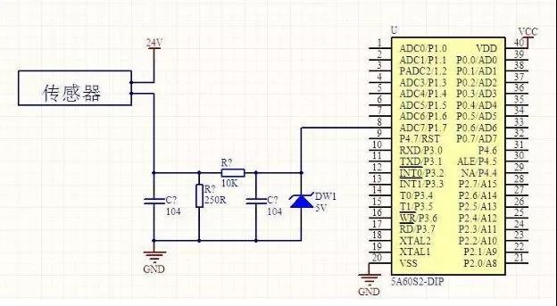 此图片使用250欧姆电阻将4-20mA电流信号转换为1至5V电压信号,然后使用RC滤波器和二极管。原谅我的模拟电路不好,我不知道连接到微控制器意味着什么。AD转换引脚。