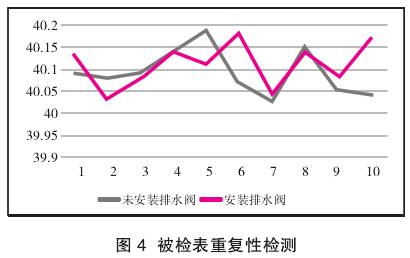 本次实验样机为Endress+Hauser型号7F2B60电磁流量计,口径50mm,实验采用的标准流量约为40m3/h。分别在相同的流量和温湿度条件下,对未安装排水阀的管道和安装有排水阀的管道进行10次重复性测量,测量结果如图4所示。