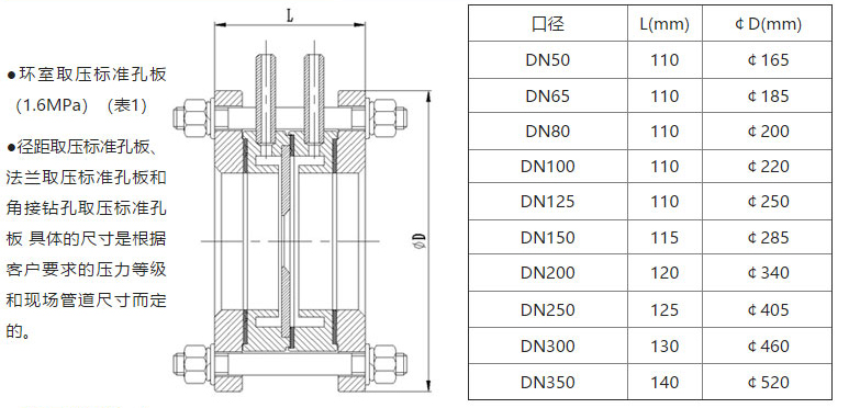 ③适用直径比β为0.22~0.75,雷诺数ReD≥5000 管道直径DN50~1000mm,允许外推到5000mm。β=d/D,d—孔板开孔直径;D—管道实际内径