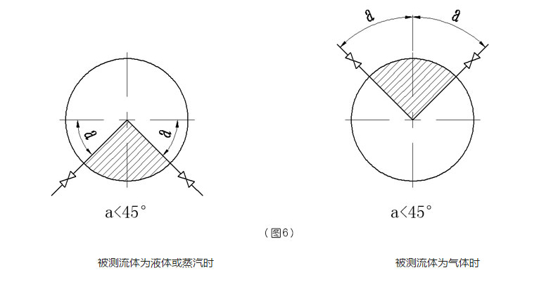 ①如图4和5所示:测量液体和水蒸汽介质流量时,取压管口最佳安装角度为0°和180°;如果在0°和180°不可能安装时,可在0°~60°和120°~180°范围内选择。但差压变送器必须垂直安装在三阀组的垂直端面上。