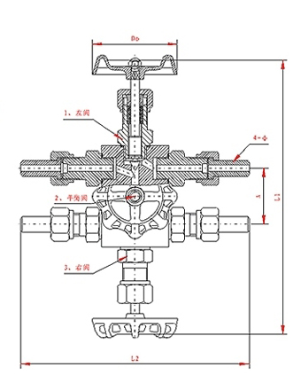 QFF3三阀组由高、低压阀及平衡阀组成成为一体,与差压变送器配套适用。它作用是将差压变送器正、负测量室与引压点导通或断开、或将正、负测量室断开和导通,引压、输压点直接与钢管连接,连接采用焊接,可采用其它连接方式。